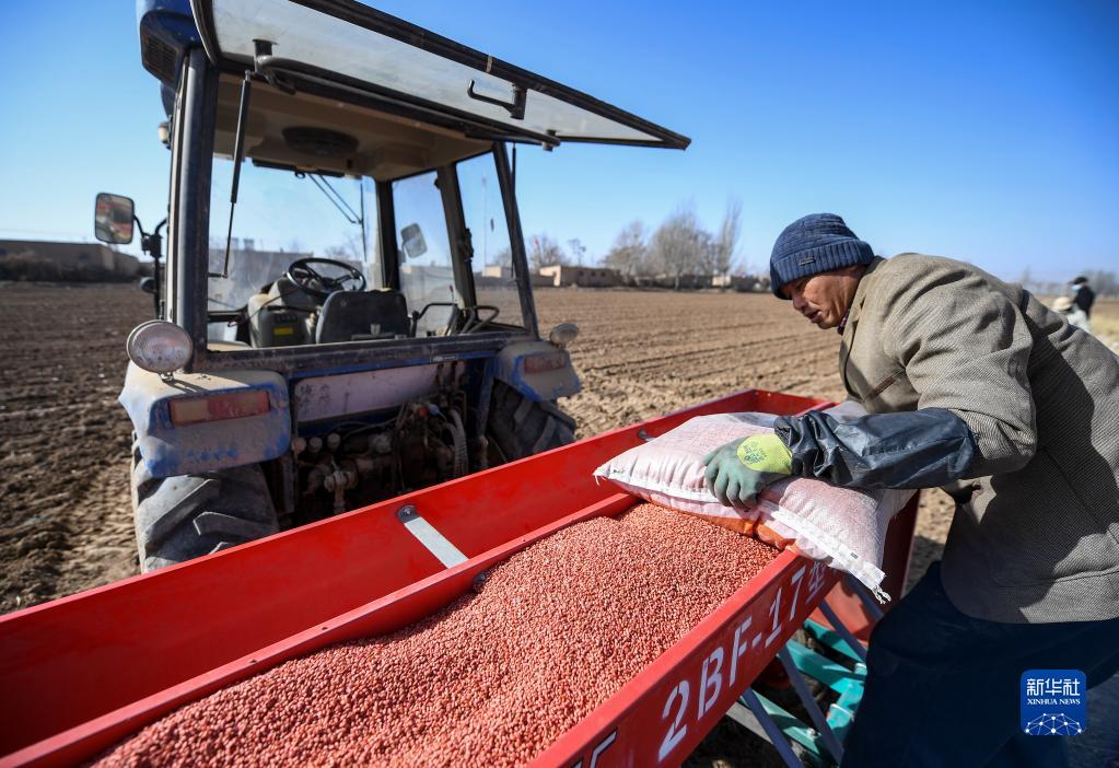 3月3日,在寧夏銀川市賀蘭縣立崗鎮銀星村,農戶(hù)向農機添加小麥種子。