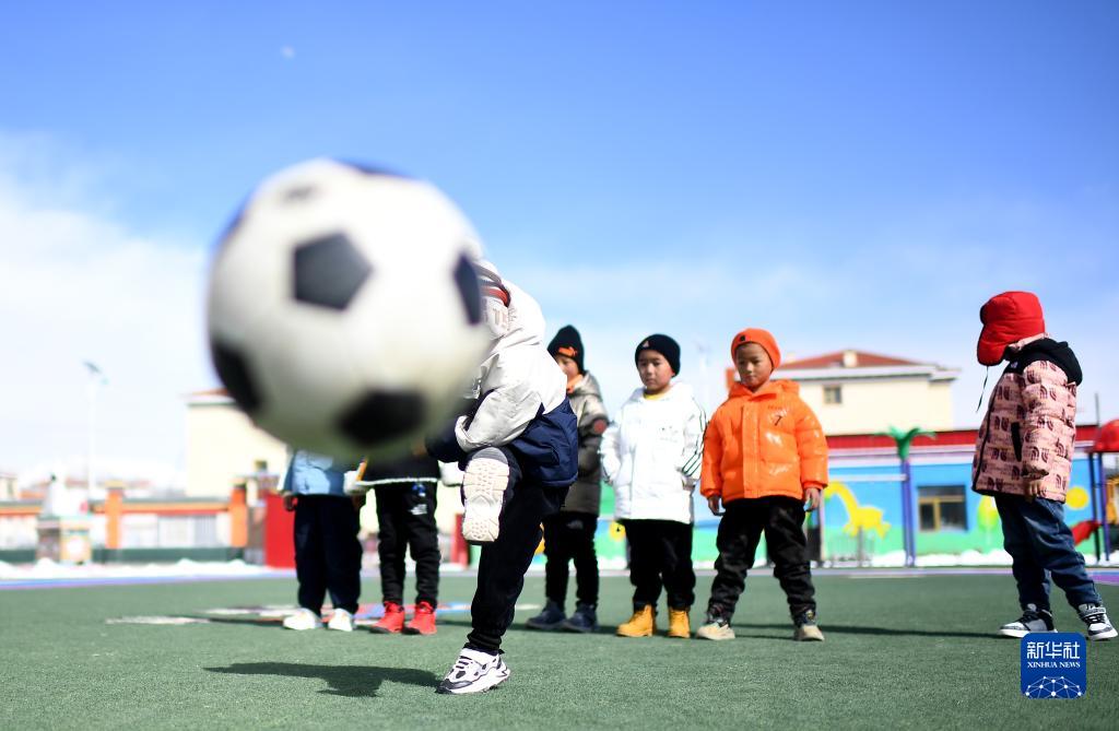 3月1日,在玉樹(shù)州治多縣,城南幼兒園小朋友桑周尼瑪(前)在練習射門(mén)。