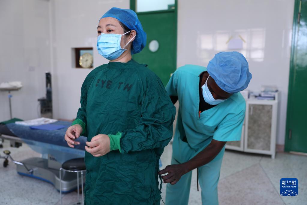 2月23日,在坦桑尼亞桑給巴爾島納茲莫加醫院,董莉莉(前)在術(shù)前換上手術(shù)衣。