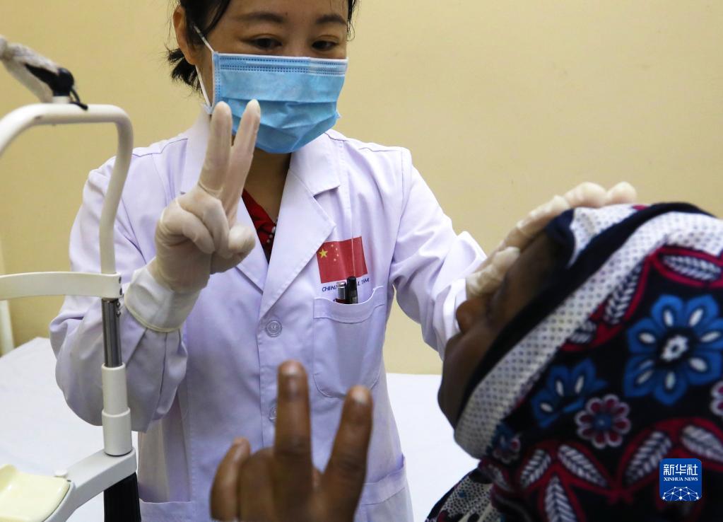 2月24日,在坦桑尼亞桑給巴爾島納茲莫加醫院,董莉莉(左)在術(shù)后第一天為穆欣進(jìn)行視力檢查。
