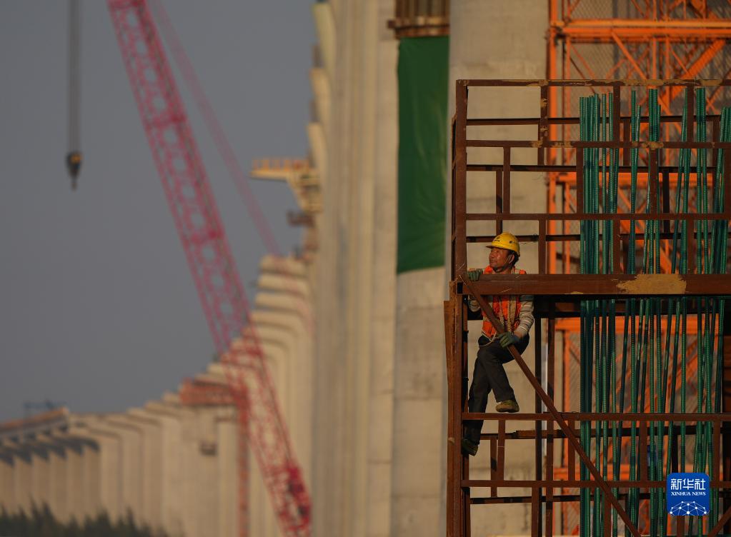 中交路建施工人員在黃茅??绾Mǖ栏邫诟鄞髽蜻M(jìn)行墩柱基樁建設(3月10日攝)。