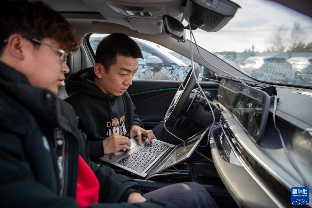 3月17日,在漠河紅河谷寒地試車(chē)基地,工作人員在調整車(chē)輛數據。