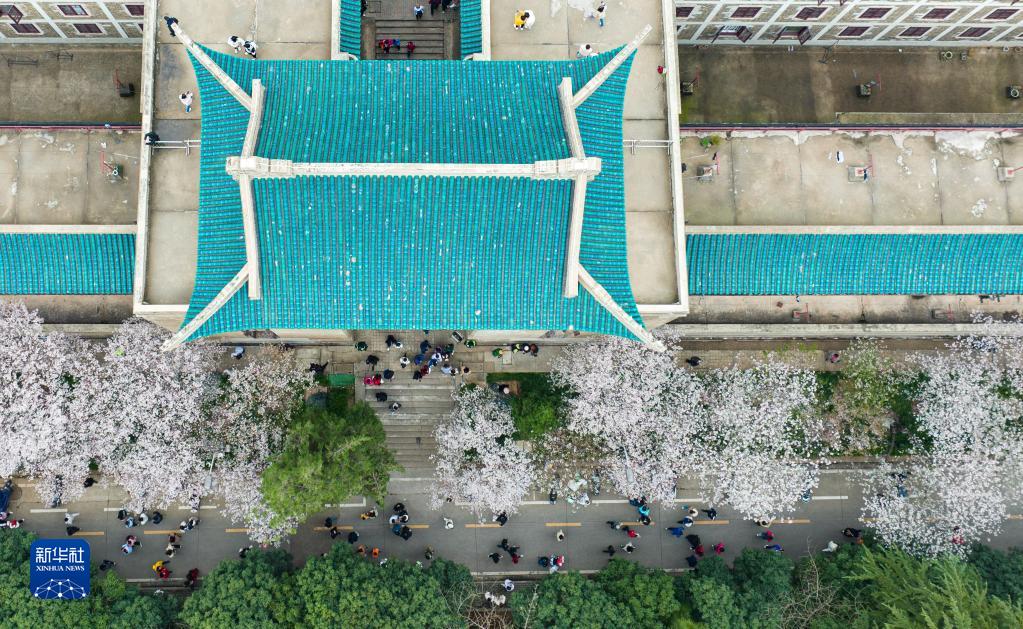 3月18日,來(lái)自各地的抗疫醫護人員及家屬在武漢大學(xué)校園賞櫻(無(wú)人機照片)。