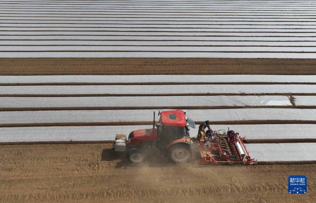 3月18日,唐山市曹妃甸區第六農場(chǎng)一家農業(yè)合作社的社員在使用機械設備播種(無(wú)人機照片)。