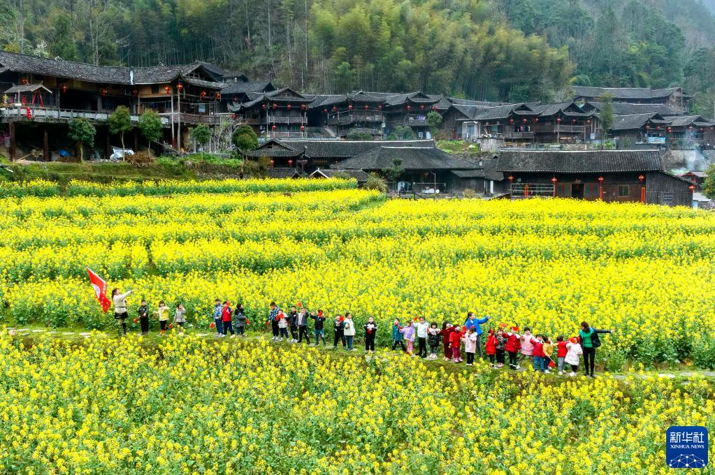 春暖花開(kāi)時(shí)節,在鄂西山區湖北省宣恩縣彭家寨風(fēng)景區,綻放的油菜花仿佛給古吊腳樓群周邊田園鋪上一層色彩鮮艷的花毯,滿(mǎn)園春色引來(lái)眾多游人。