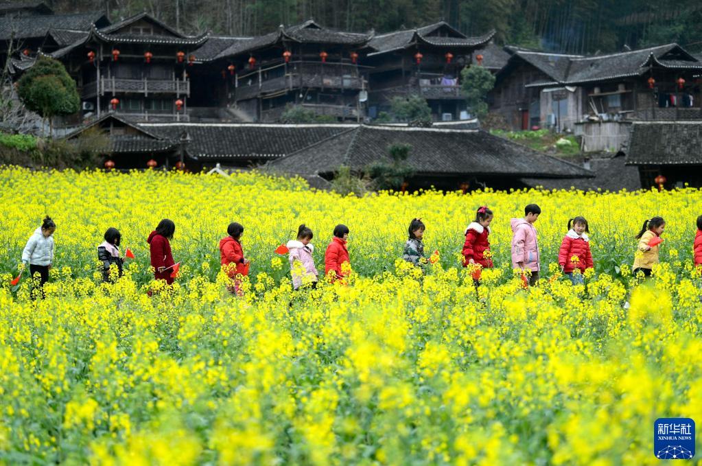 3月18日,孩子們在湖北省宣恩縣彭家寨古吊腳樓前的油菜花田里行走。