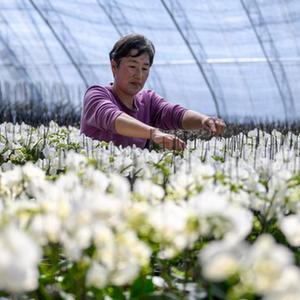 3月18日,在雙灤區大貴口村一處大棚,農民在管護鮮花。
