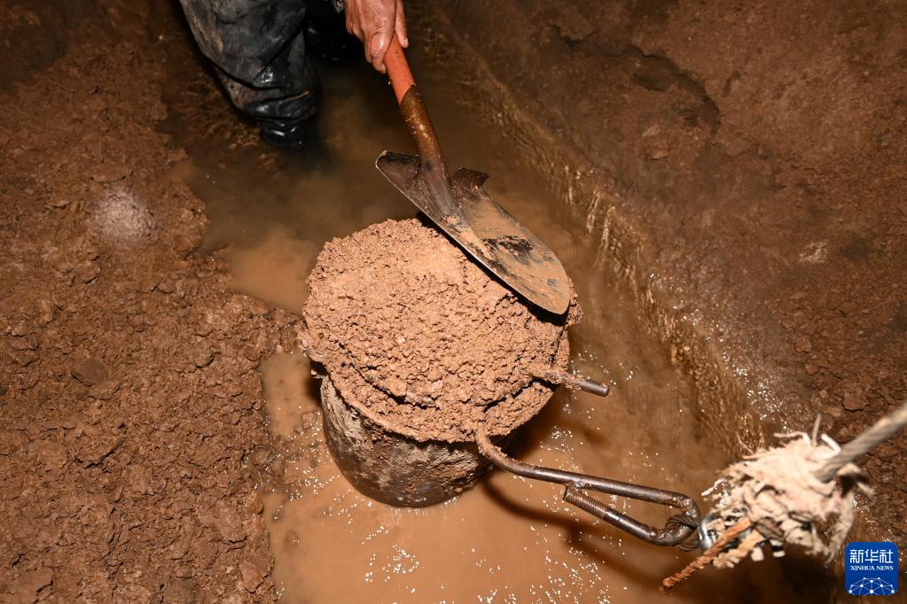 在新疆吐魯番市高昌區艾丁湖鎮附近的戈壁灘,花園村掏撈隊的隊員在坎兒井暗渠內清理淤泥(3月9日攝)。