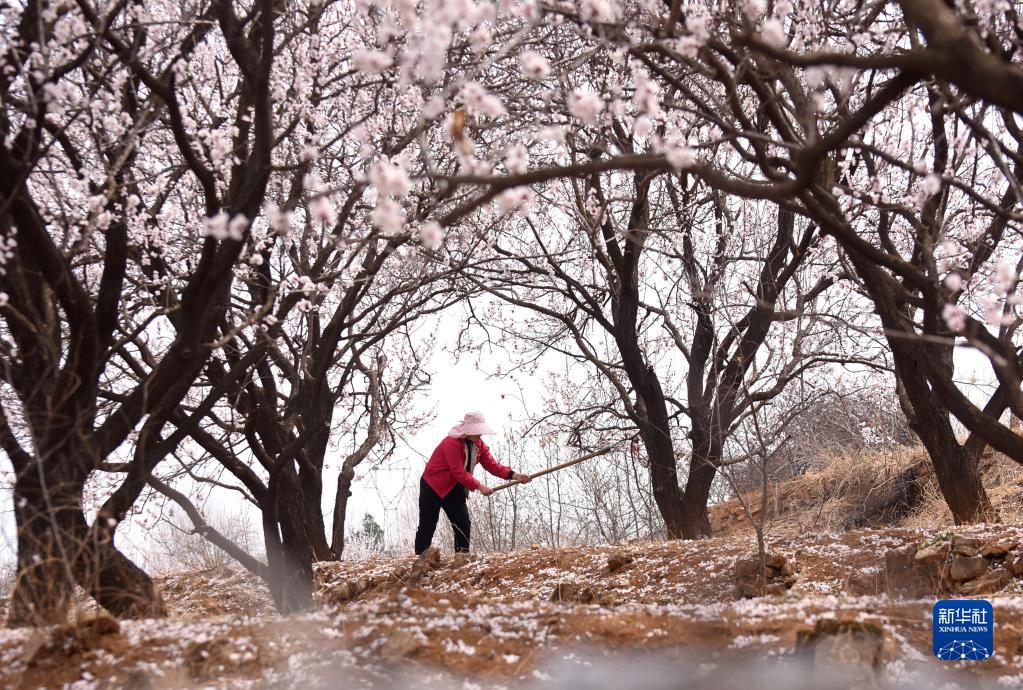 3月20日,山東省淄博市沂源縣石橋鎮松峪村的農民在杏花田間勞作。