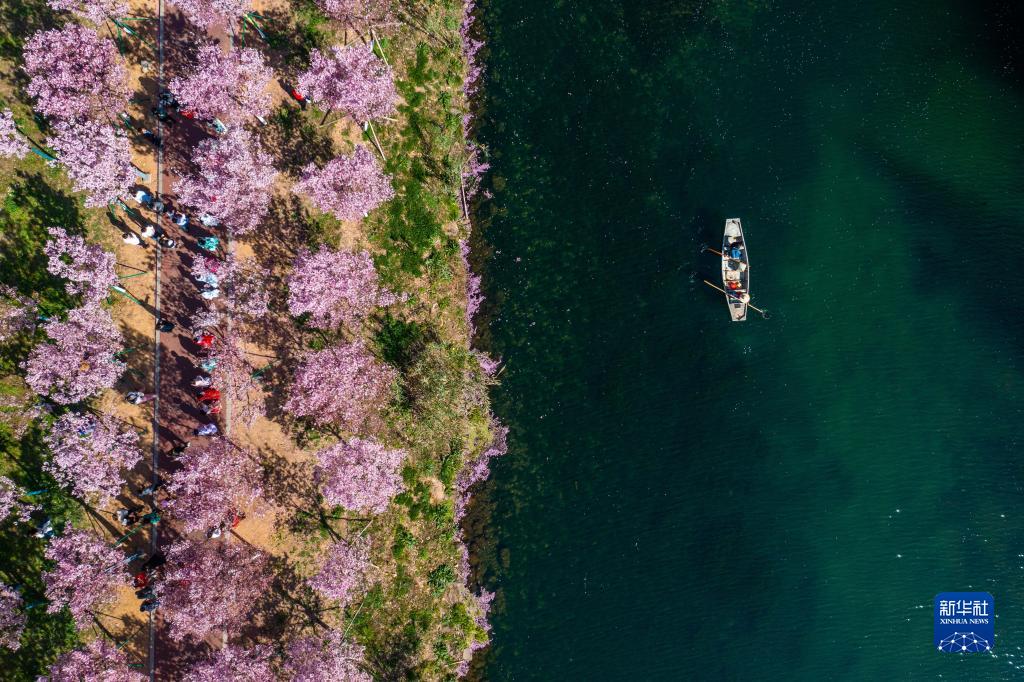 3月14日,在浙江省金華市浦江縣浦陽(yáng)江同樂(lè )段,工作人員乘船在打撈水面漂浮物(無(wú)人機照片)。該江段通過(guò)生態(tài)治理、河湖清淤、景觀(guān)改造、種植水生植物等綜合整治措施,利用河道右岸的落羽杉林,在渠道上鋪設林蔭棧道,栽種1400余株櫻花形成1.5公里的櫻花大道,造就一片春有櫻花落英、秋有杉葉火紅的四季美麗風(fēng)景,滿(mǎn)足群眾賞景及親水需求。