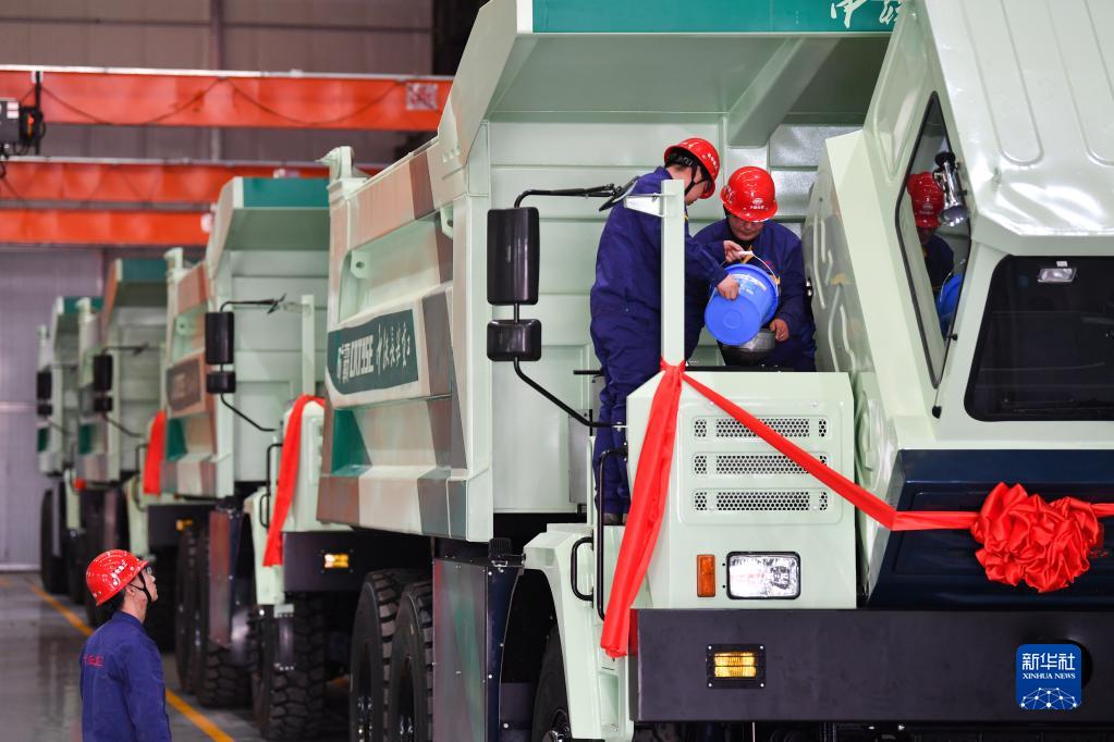3月22日,中鐵長(cháng)安重工有限公司的工人在生產(chǎn)線(xiàn)上調試即將下線(xiàn)的95噸純電動(dòng)礦用自卸車(chē)。