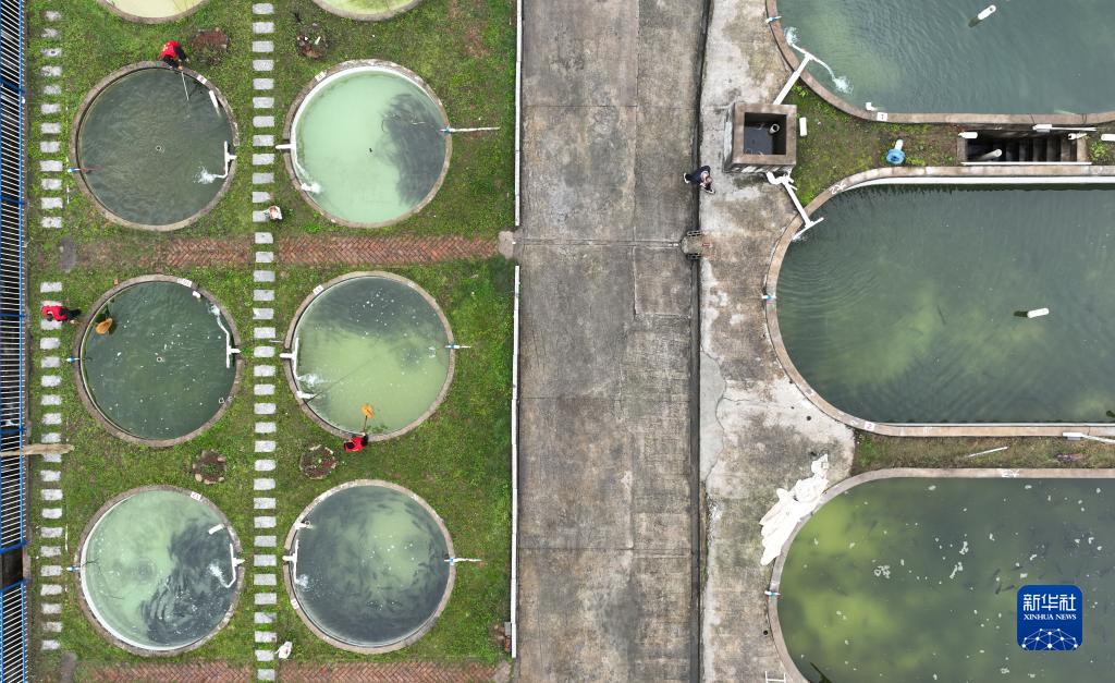 3月22日,衡山縣嶺坡鄉燈山村泉水魚(yú)養殖基地工作人員在捕魚(yú)(無(wú)人機照片)。