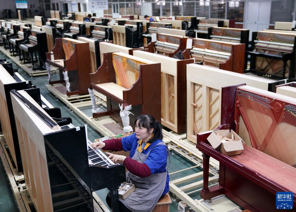 3月23日,工人在德清縣洛舍鎮東衡村一家鋼琴制造企業(yè)內裝配鋼琴。