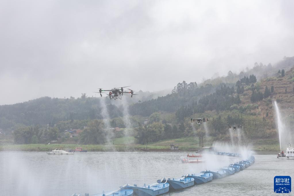 3月23日,在重慶市銅梁區高樓鎮涪江流域突發(fā)水污染事件應急聯(lián)合演練現場(chǎng),工作人員運用無(wú)人機、水上霧炮船等設備模擬向江面拋灑重金屬捕捉劑。