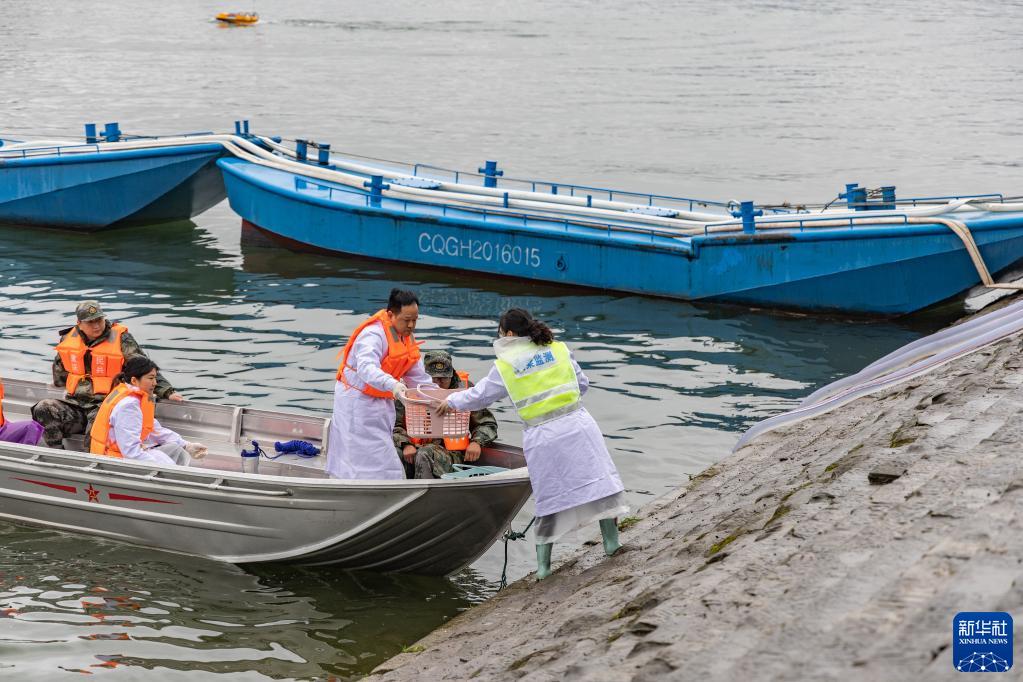 3月23日,在重慶市銅梁區高樓鎮涪江流域突發(fā)水污染事件應急聯(lián)合演練現場(chǎng),環(huán)境監測人員將取到的江水樣品遞給岸邊工作人員。