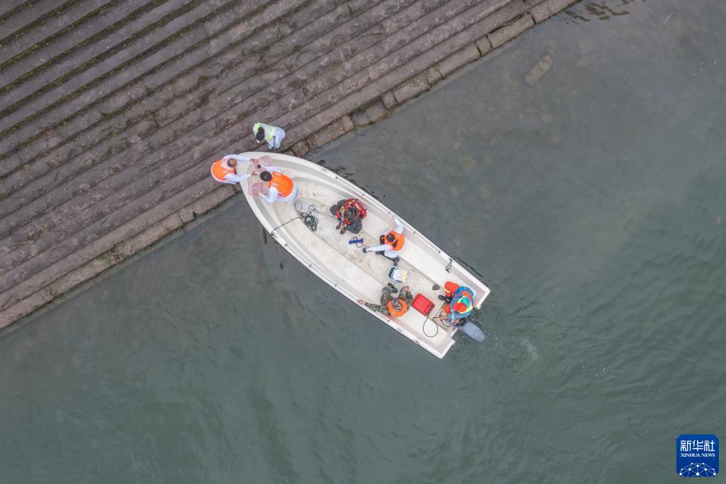 3月23日,在重慶市銅梁區高樓鎮涪江流域突發(fā)水污染事件應急聯(lián)合演練現場(chǎng),環(huán)境監測人員將取到的江水樣品遞給岸邊工作人員(無(wú)人機照片)。