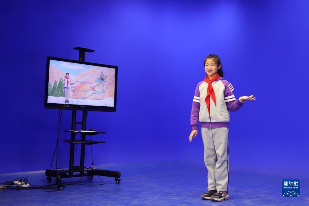 3月23日,一名學(xué)生在內蒙古自治區氣象局天氣預報演播室內體驗演播過(guò)程。
