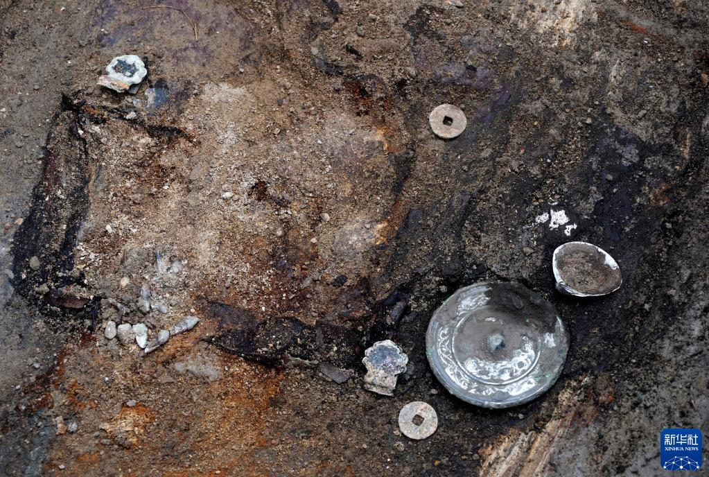 這是宋國故城遺址內的唐代墓葬出土的銅錢(qián)、銅鏡等(3月25日攝)。新華社記者 李安 攝