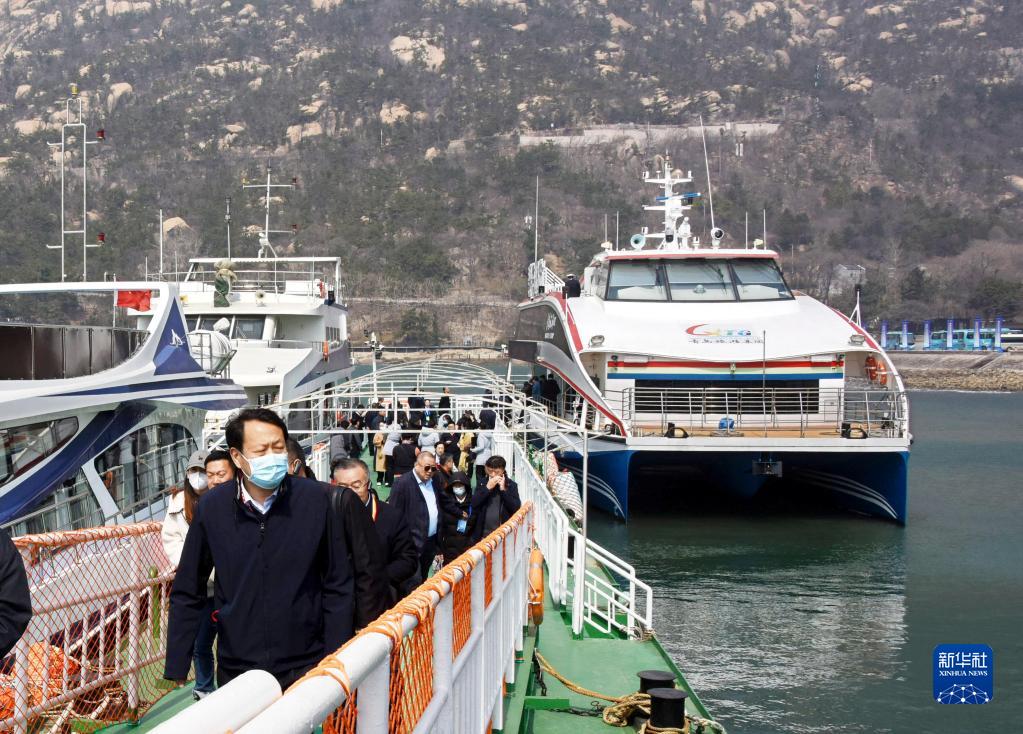 3月27日,在青島嶗山太清游船碼頭,游客下船準備游覽嶗山。