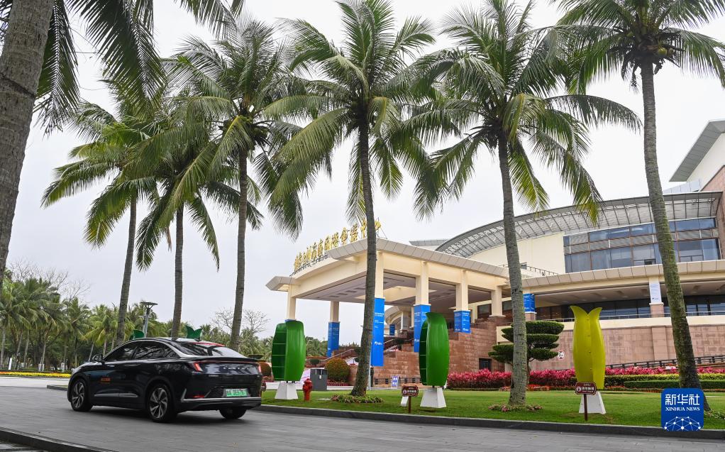 3月28日,一輛新能源車(chē)從博鰲零碳示范區內的花朵風(fēng)機前駛過(guò)。