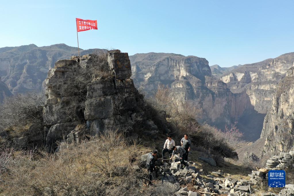 村民們在山西省壺關(guān)縣大峽谷鎮青龍峽村山上修路(3月8日攝,無(wú)人機照片)。新華社記者 詹彥 攝