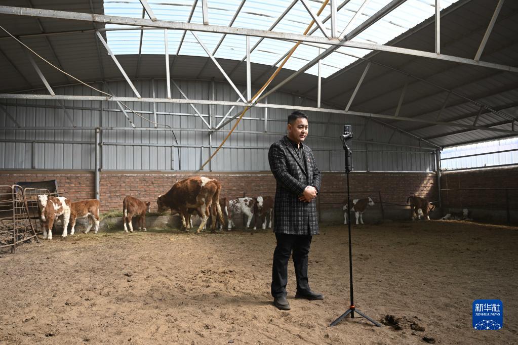 3月28日,嘎查黨支部書(shū)記寶音賀希格在巴彥額日和圖嘎查集體所有的牛棚內直播。