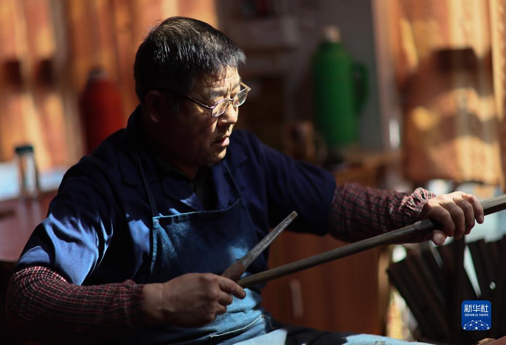 3月28日,在江蘇無(wú)錫梅村街道二胡產(chǎn)業(yè)園,工人在制作琴桿。