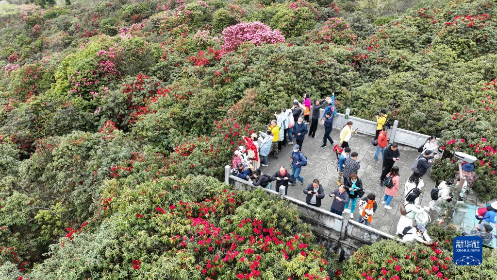 3月27日,游客在貴州省畢節市百里杜鵑管理區天然野生杜鵑林參觀(guān)游覽(無(wú)人機照片)。