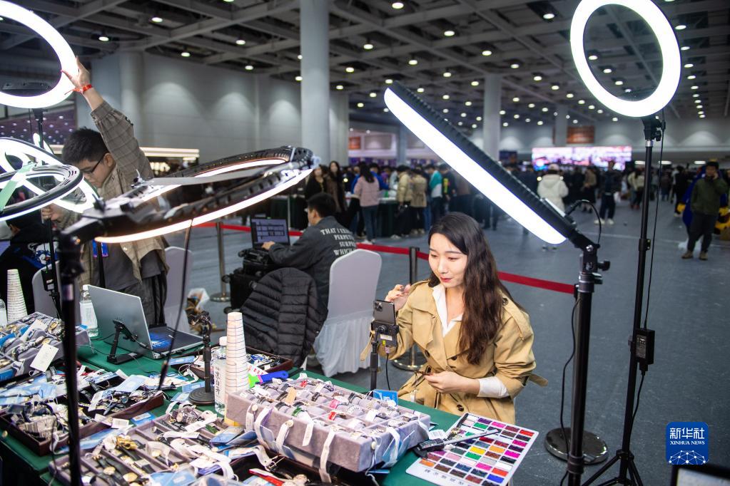 3月29日,在湖南國際會(huì )展中心,一名女子通過(guò)直播推銷(xiāo)商品。