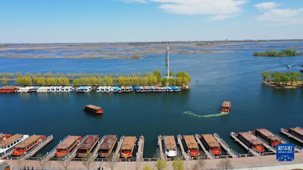 4月7日,處于試運營(yíng)階段的白洋淀“水上巴士”項目畫(huà)舫船在白洋淀內行駛(無(wú)人機照片)。