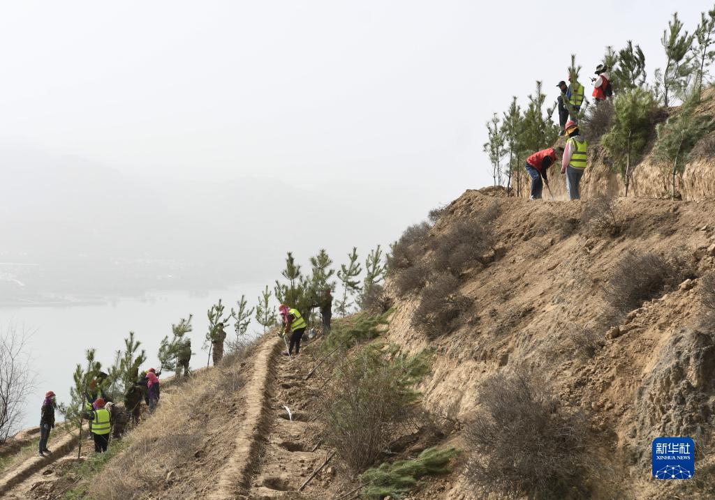 4月11日,人們在黃河劉家峽水庫岸邊植樹(shù)。