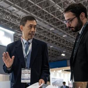 4月11日,在巴西里約熱內盧舉行的2023拉丁美洲航空航天與防務(wù)展(又稱(chēng)巴西防務(wù)展)上,參觀(guān)者在同方威視技術(shù)股份有限公司展臺交談。