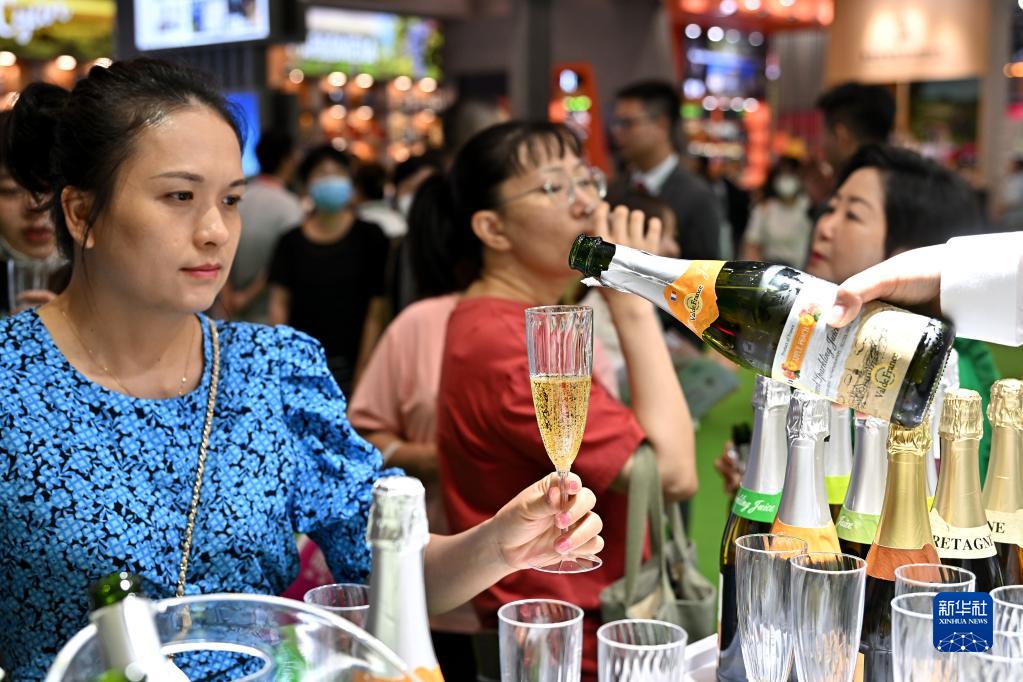 4月12日,參觀(guān)者在消博會(huì )上品嘗保留著(zhù)香檳口感的無(wú)醇起泡果汁飲品。