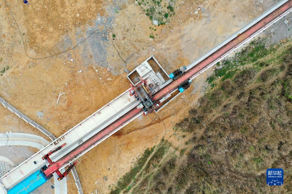 4月12日,工作人員在尖坡寨特大橋進(jìn)行預制梁架設施工(無(wú)人機照片)。