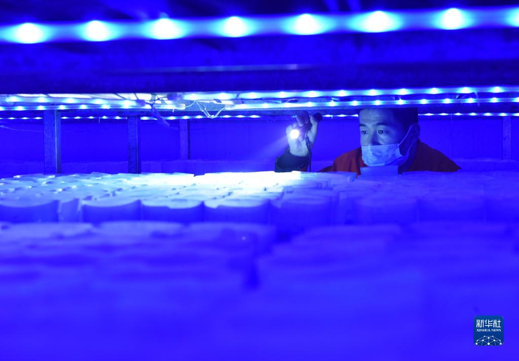 4月13日,河北省臨西縣一家食用菌生產(chǎn)企業(yè)的員工在菌菇培育車(chē)間查看金針菇的生長(cháng)情況。