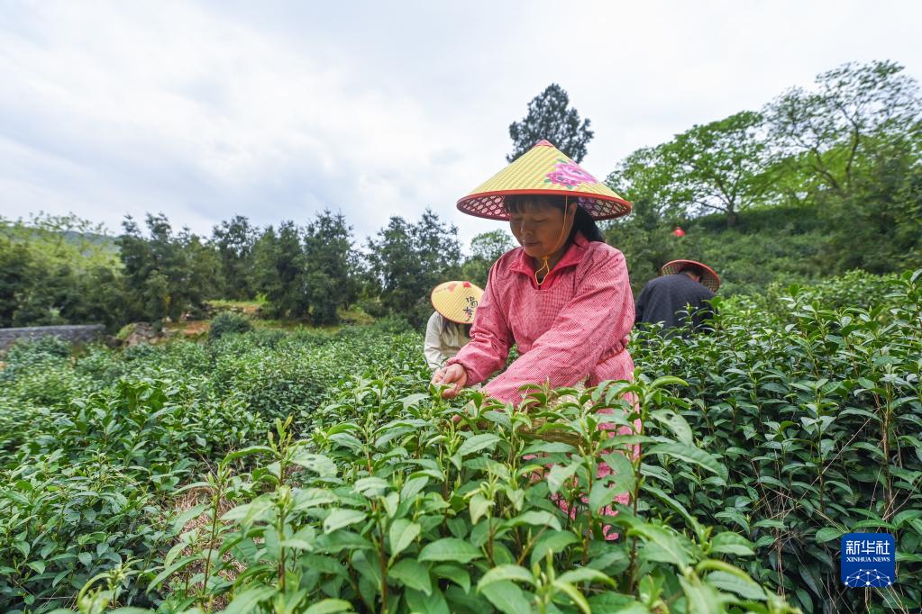 4月13日,在諸暨市東白湖鎮上家湖村的茶田里,茶農張秀麗在采摘石筧茶。