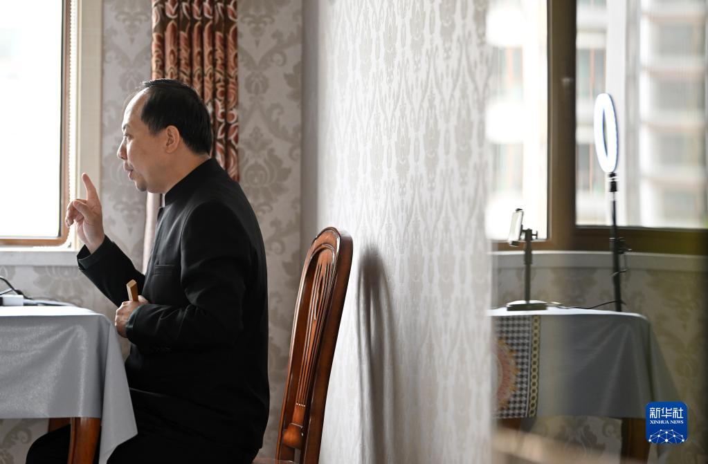 謝連華在家里錄制口述村志故事的短視頻(4月12日攝)。