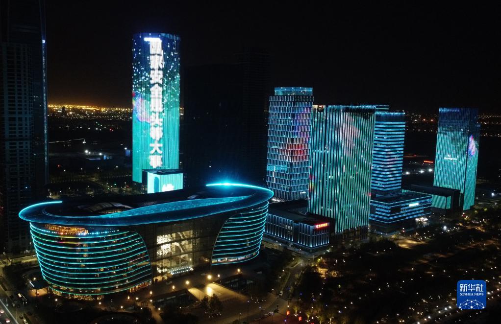 天津市濱海新區中心商務(wù)區部分樓宇為全民國家安全教育日亮燈(4月14日攝,無(wú)人機照片)。