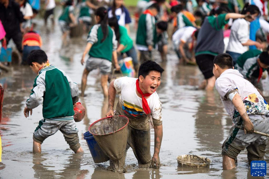 4月15日,在寧鄉市灰湯鎮花果山村,學(xué)生在比賽捉泥鰍。
