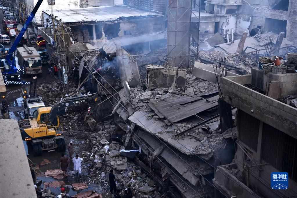 4月13日,在巴基斯坦卡拉奇,救援人員清理因火災坍塌的工廠(chǎng)廢墟。