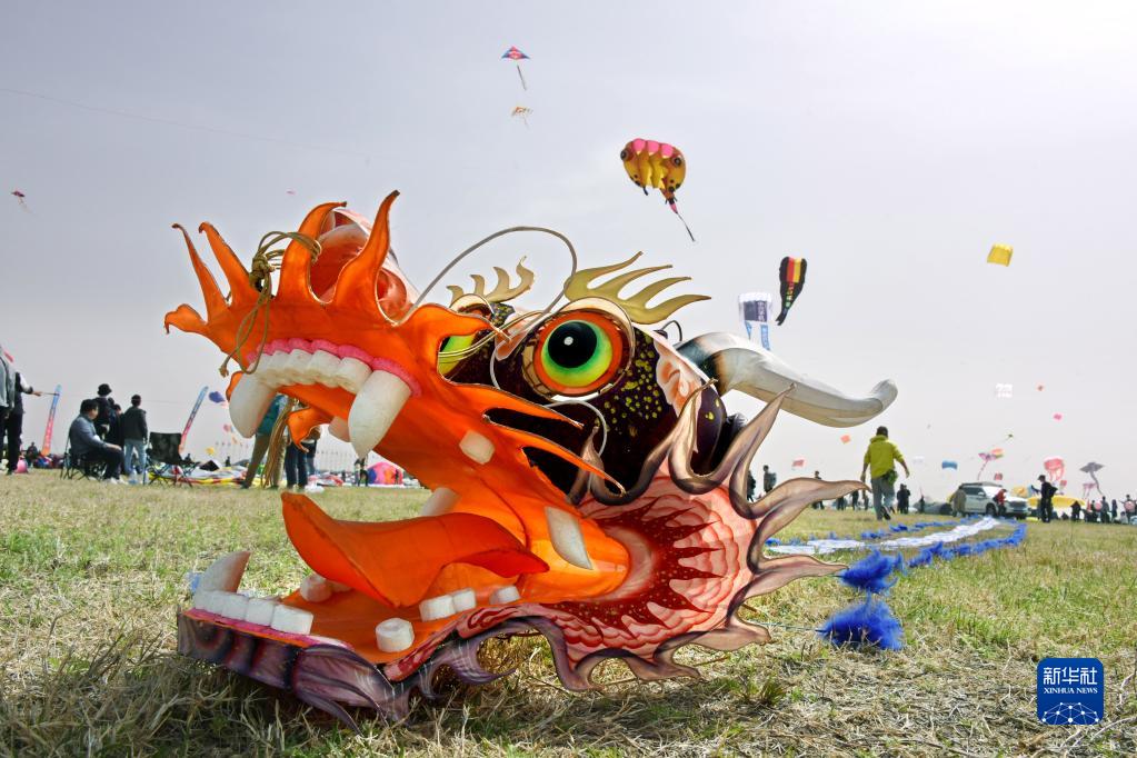 4月15日,金龍造型的風(fēng)箏準備放飛。