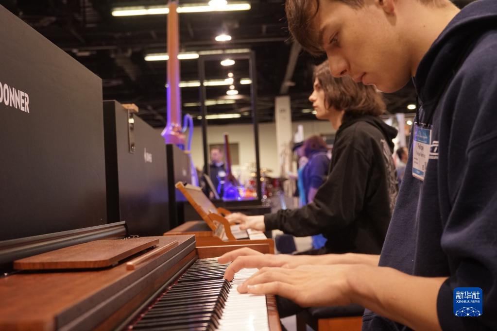 4月13日,在美國加利福尼亞州阿納海姆會(huì )展中心,參觀(guān)者在廣州藍深科技旗下“唐農”樂(lè )器展位試彈樂(lè )器。