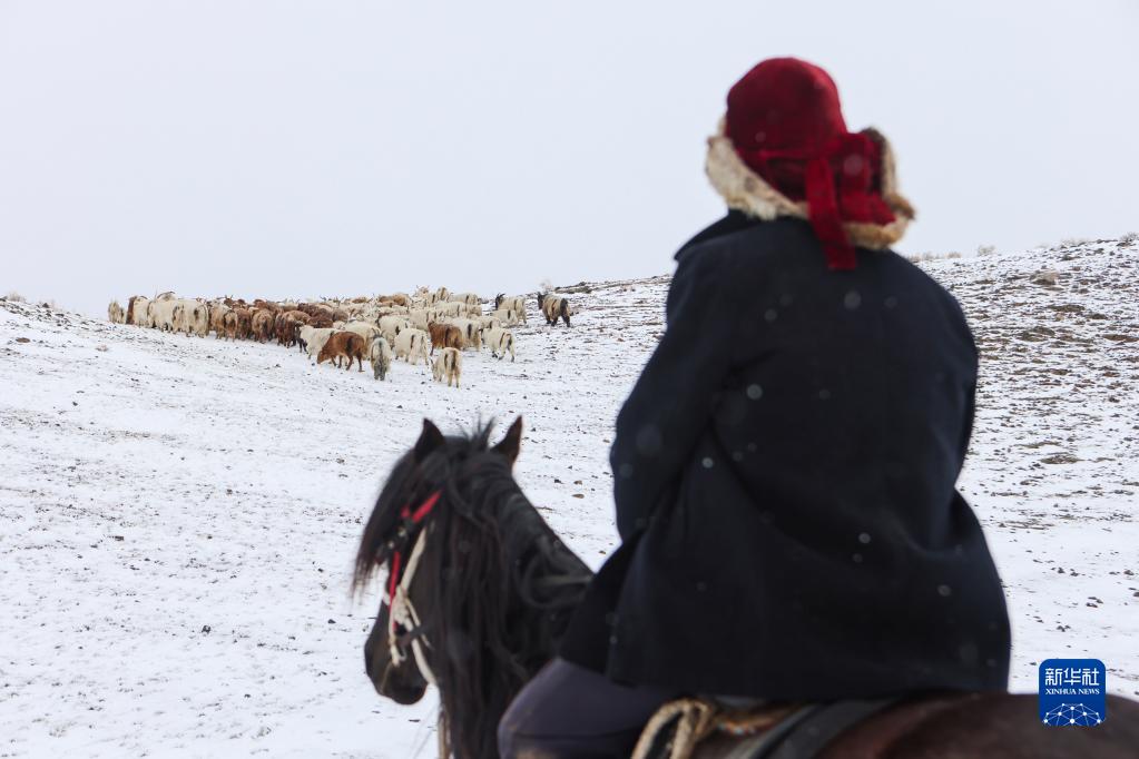 春雪突至,哈布得拉什么在春草場(chǎng)上放牧(4月12日攝)。