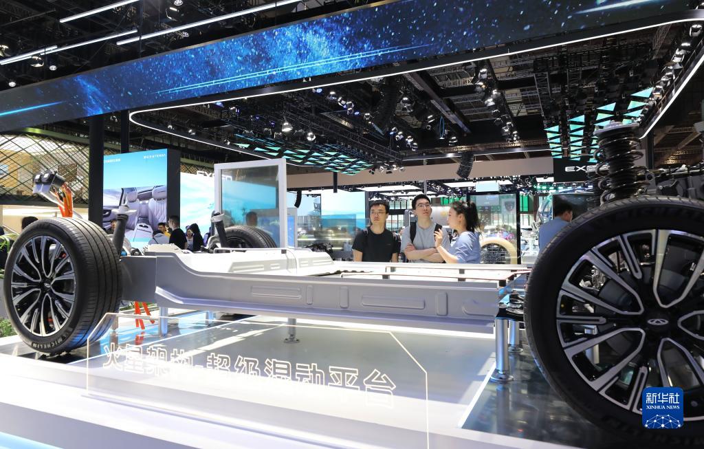 4月19日,參觀(guān)者在奇瑞汽車(chē)展臺聽(tīng)工作人員講解火星架構超級混動(dòng)平臺的特點(diǎn)。
