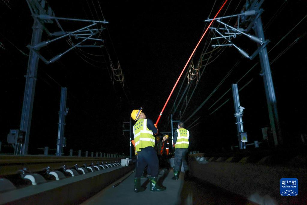 4月20日,中鐵武漢電氣化局工作人員在都勻東站附近的軌道上進(jìn)行驗電操作。