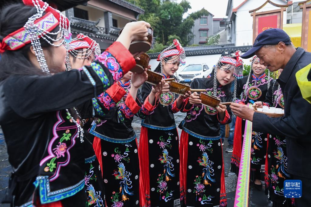 4月22日,畬族姑娘身著(zhù)傳統服飾在團結村的“三月三”旅游文化周上給游客敬上迎賓酒。
