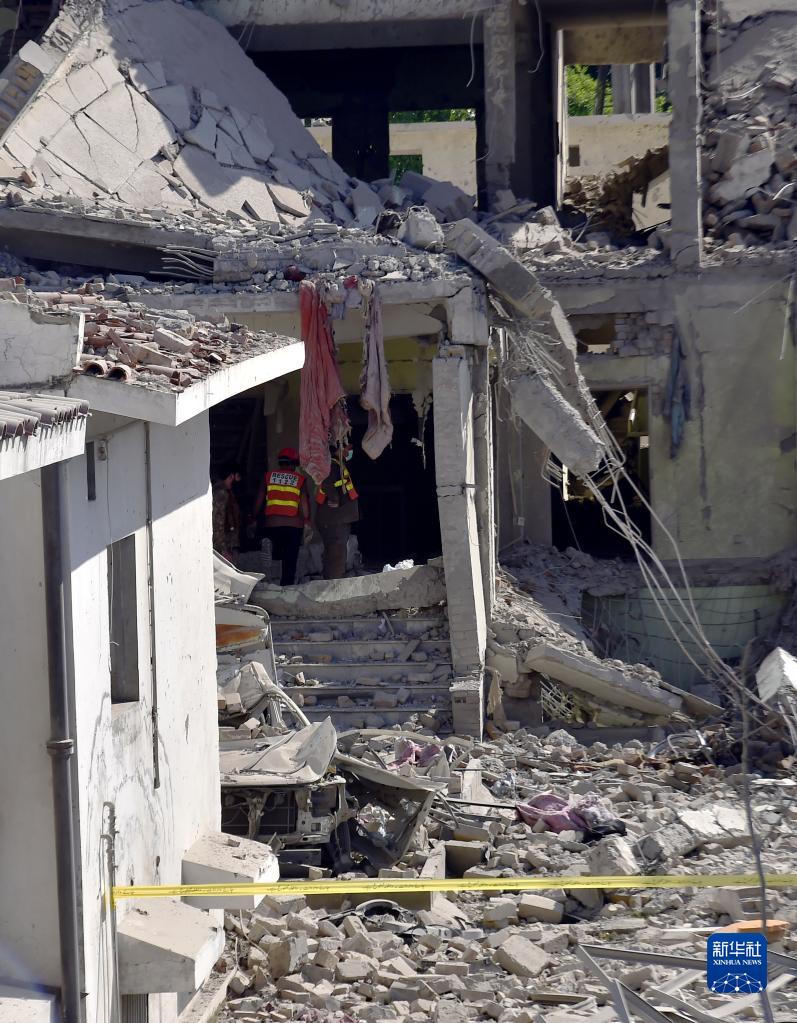 4月25日,在巴基斯坦斯瓦特地區,救援人員在爆炸襲擊現場(chǎng)搜救。