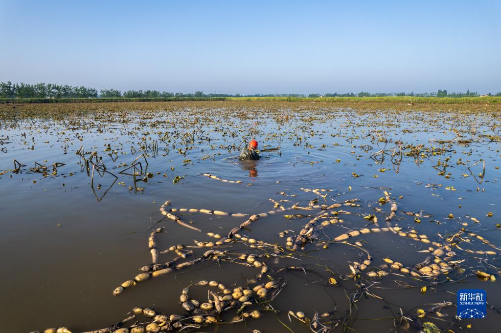 4月26日,藕農在南縣中魚(yú)口鎮菱角湖村的荷塘中采挖蓮藕(無(wú)人機照片)。
