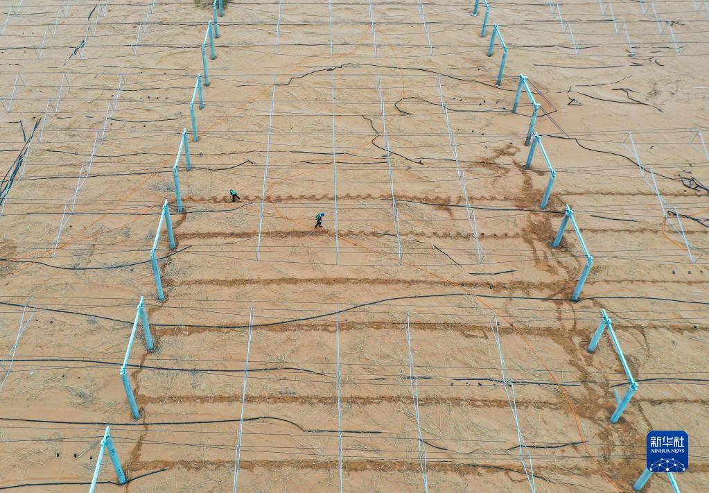 近日,在內蒙古自治區杭錦旗億利庫布其沙漠光伏治沙基地,工人們忙著(zhù)在光伏架下種植耐旱苗木,用于防風(fēng)固沙。目前,億利庫布其沙漠光伏治沙基地正在建設中,此次規劃種植面積上萬(wàn)畝。