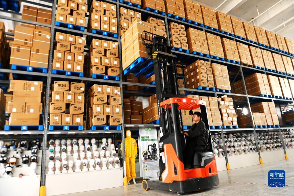 4月26日,在山東省臨沂市蘭山區一家科技有限公司,一名員工在物流園內整理貨物。